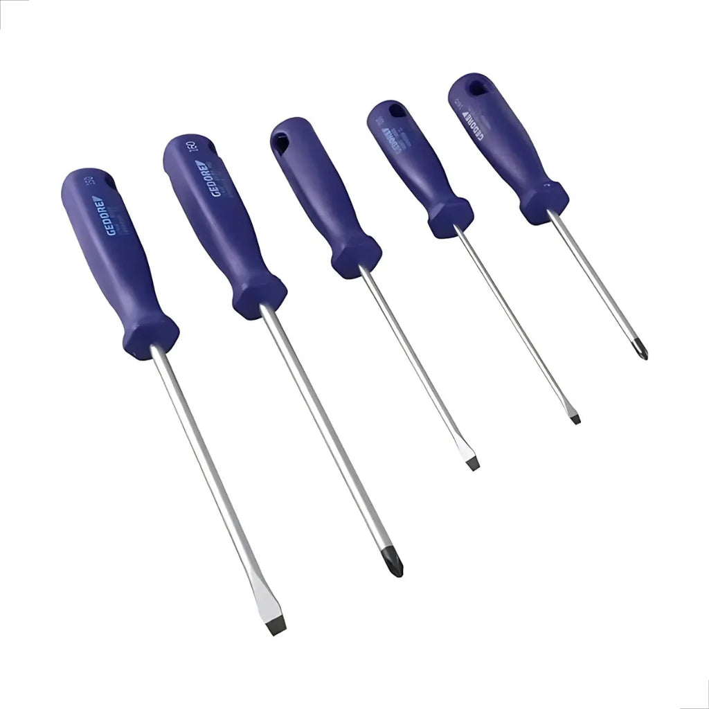 Todo mecânico, eletricista e marceneiro de respeito sabe: ferramenta manual de uso diário tem que ser Gedore. O Jogo de Chaves 150-160S (5 Peças) é forjado no lendário Aço Gedore-Vanadium, garantindo que a haste não entorte sob pressão extrema. O grande trunfo deste kit são as pontas fosfatizadas. Elas criam um atrito perfeito que "agarra" a cabeça do parafuso, evitando aquele escorregão perigoso que destrói a fenda e a peça do cliente. É o kit definitivo para quem não tem tempo a perder com ferramenta descartável.