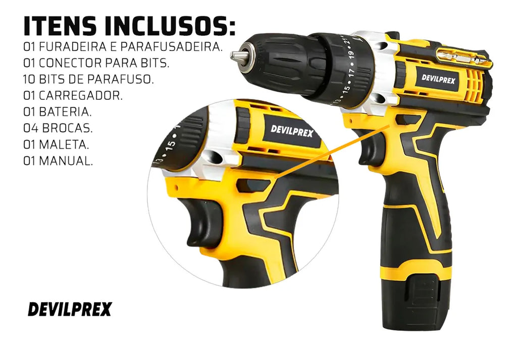 - 01 x Furadeira/Parafusadeira 12V DEVILPREX com LED e Indicador de Carga